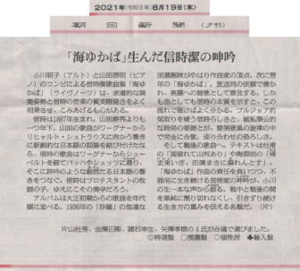 2021年 【CD】2021年7月25日 「海ゆかば 信時潔歌曲集」発売 ![]() 2021年8月19日 朝日新聞夕刊 ![]() ぶらあぼ2021年9月号 New Release Selection |